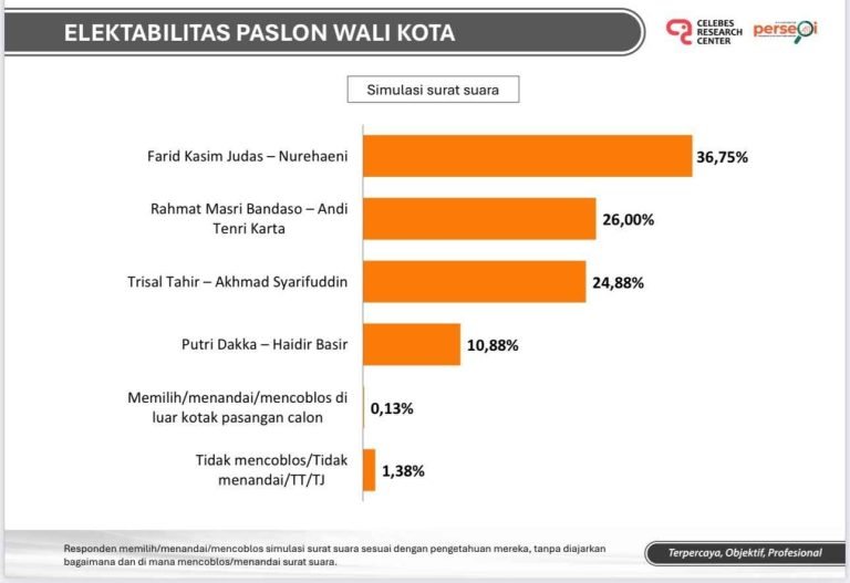 ARUS INDONESIA, Palopo – Lembaga Survei Celebes Research Center (CRC) merilis hasil survei terbaru menjelang hari pemilihan Pilwalkot Palopo 2024.