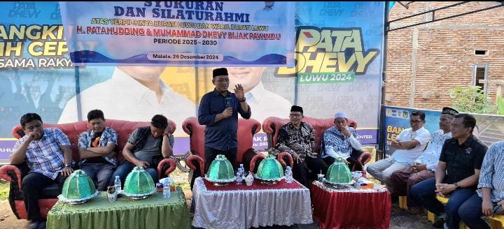 ARUS INDONESIA, Luwu – Calon Bupati Luwu terpilih H Patahudding, S.Ag, menghadiri undangan syukuran Keluarga di Malela, warga Desa malela Kecamatan Suli. Dalam pertemuan yang dihadiri ratusan warga Desa Malela tersebut Patahudding meminta untuk merajut kembali hubungan silaturahmi pasca Pilkada Luwu 2024.