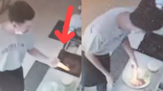 Dalam video yang diambil dari rekaman CCTV itu terlihat sebagai seorang barista di sebuah kafe yang hendak membakar makanan di depannya.